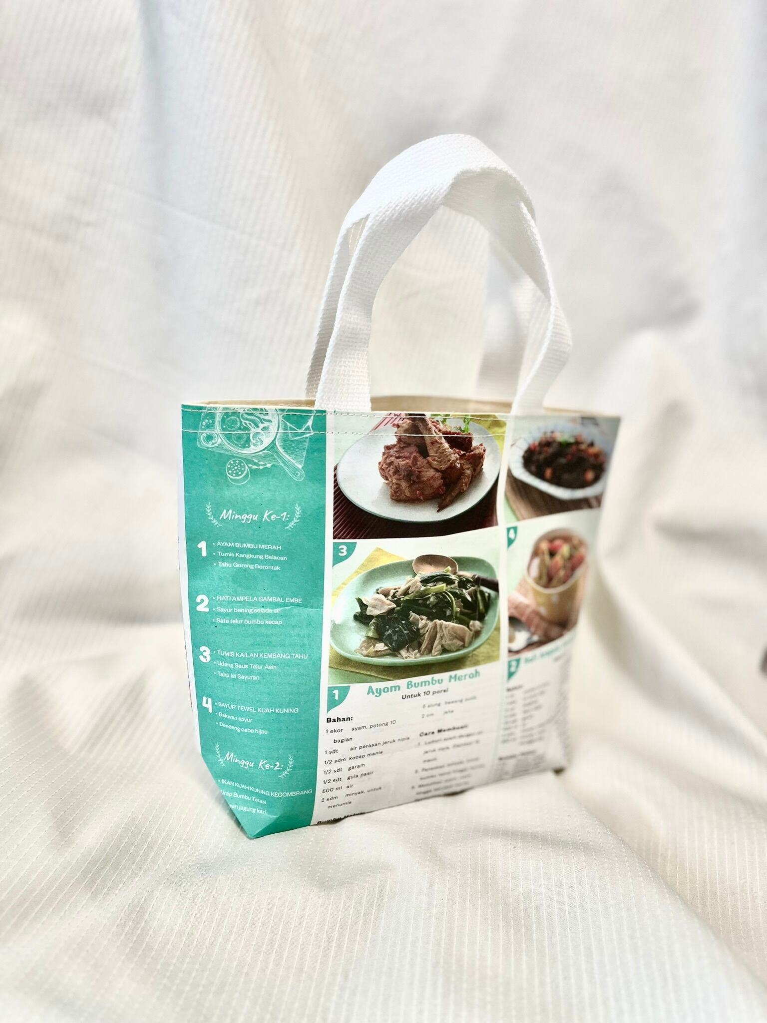 インドネシアのタブロイド紙をやわらかめのラミネート加工にして丁寧に縫い上げたアップサイクル品です。