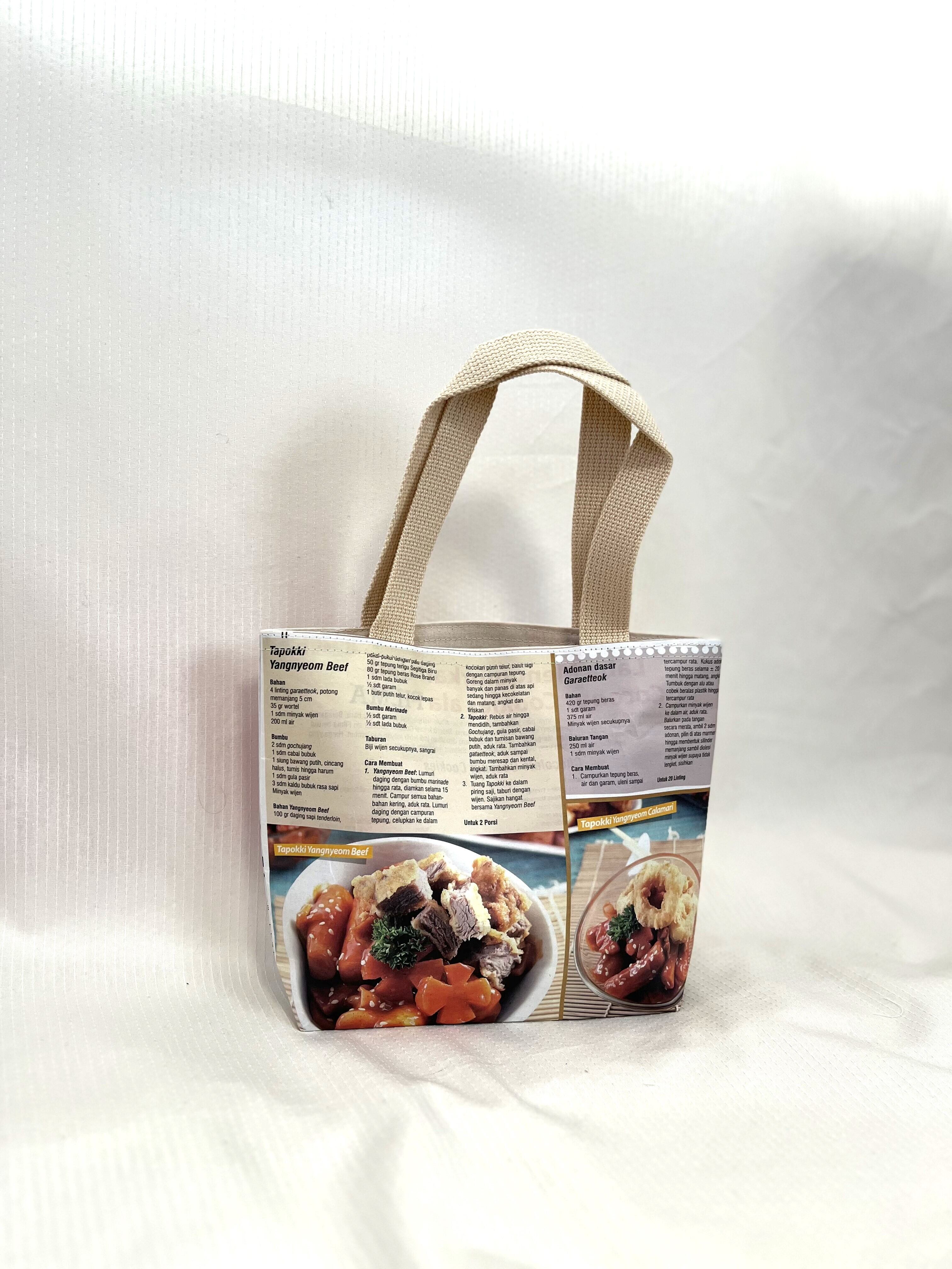 インドネシアのタブロイド紙をやわらかめのラミネート加工にして丁寧に縫い上げたアップサイクル品です。