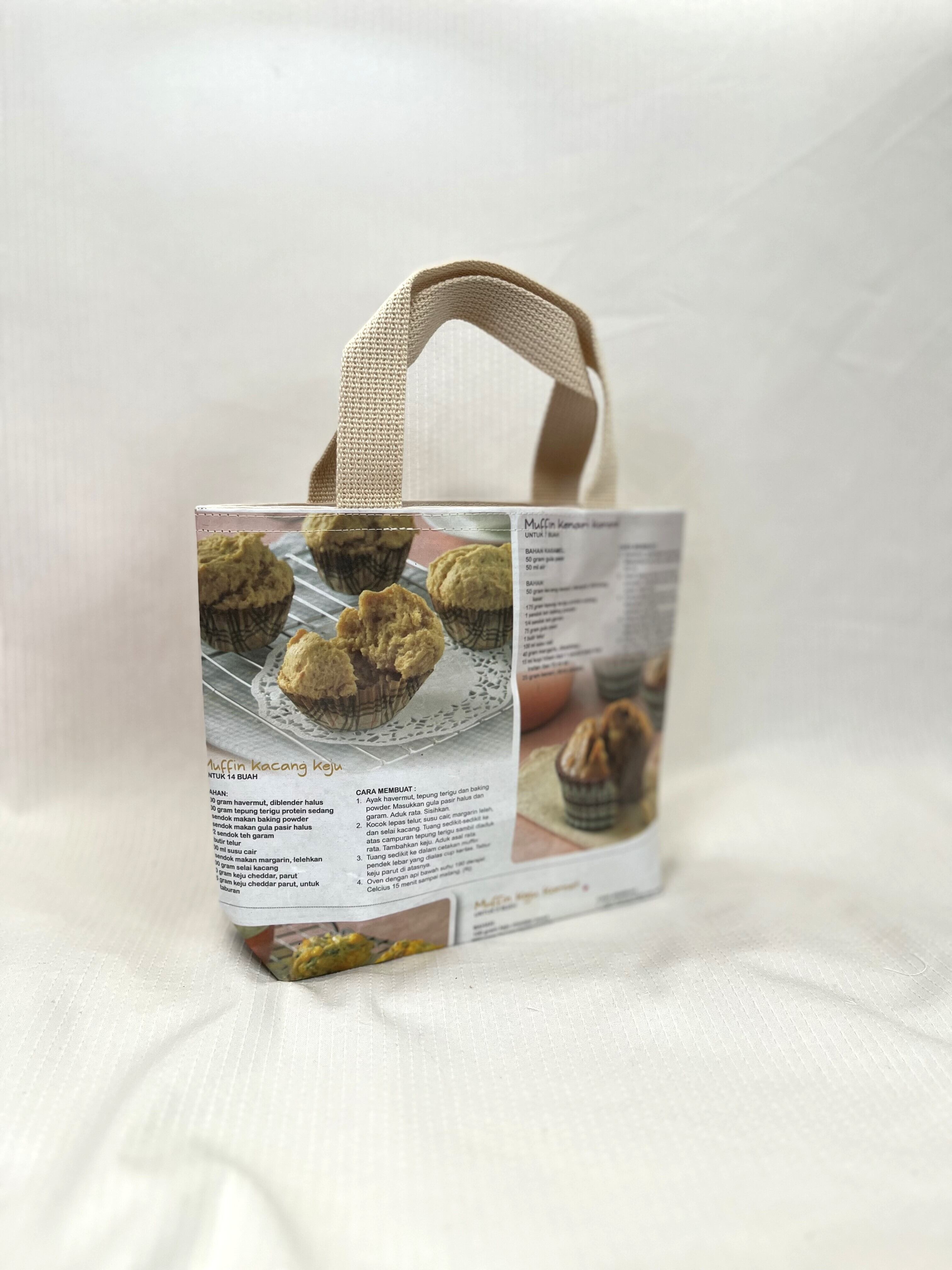 インドネシアのタブロイド紙をやわらかめのラミネート加工にして丁寧に縫い上げたアップサイクル品です。